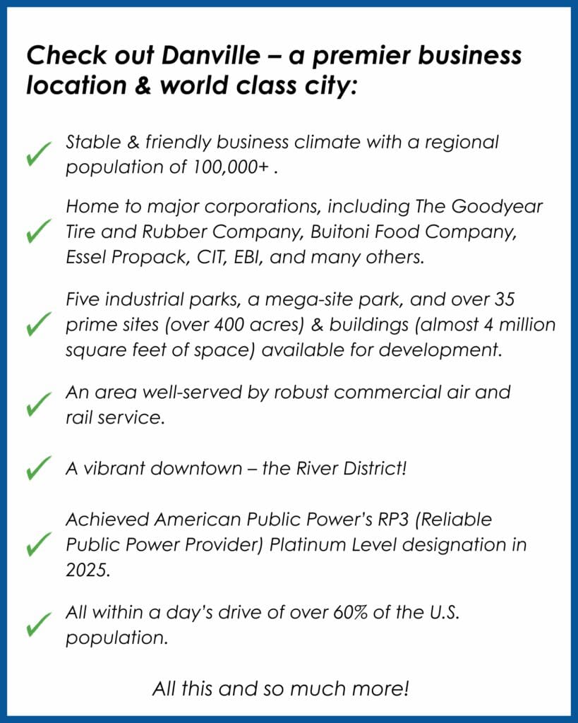 Danville’s competitiveness is enhanced by having electric rates that are among the lowest in the state, and gas rates consistently lower than those of other local suppliers. The city’s commitment to service is illustrated through it achieving the American Public Power’s RP3 (Reliable Public Power Provider) Platinum Level designation in 2025. This designation recognizes Danville as a public power utility that demonstrates leading practices in reliability, safety, and workforce development, as well as system improvement.  In addition, Danville offers significant excess water capacities that can accommodate high-volume users.